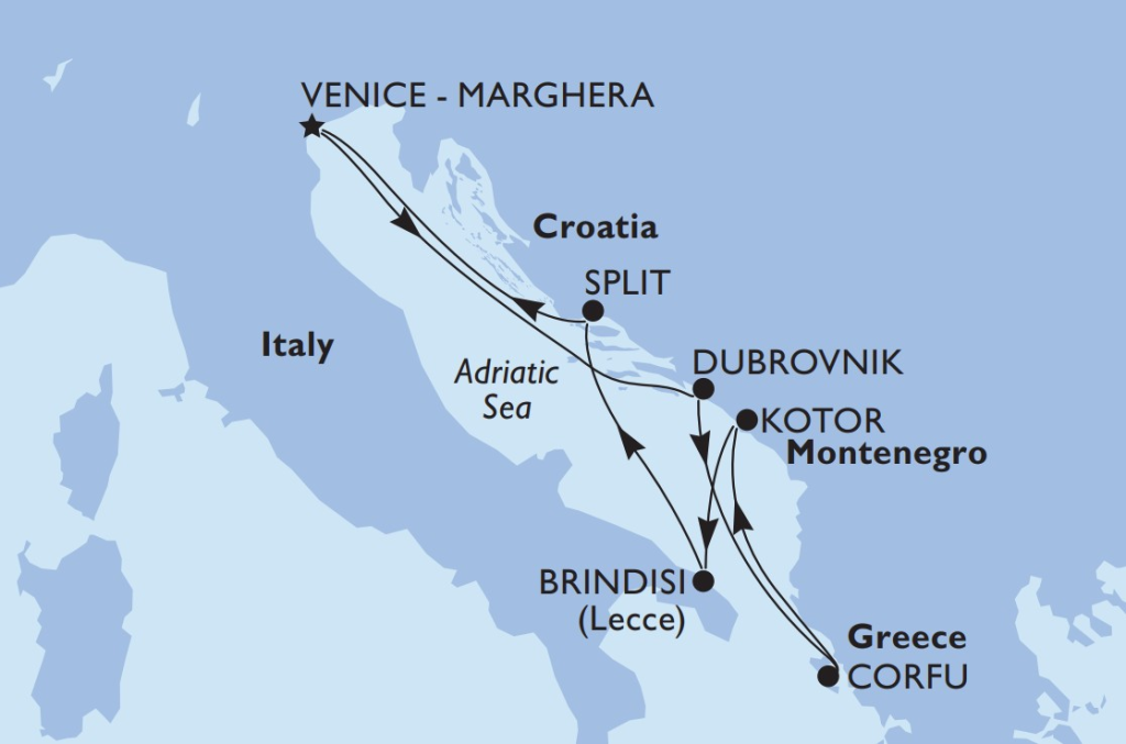 Istražite ljepote i atrakcije istočnog dijela Mediterana: od slikovitih kanala Venecije do bisera Jadrana – Dubrovnika, potom čarobnog Krfa, šarmantnog Kotora i Brindisija smještenog u talijanskoj regiji Apuliji – imat ćete priliku doživjeti bogatu kulturu, kušati izvrsnu hranu i opustiti se na predivnim plažama. Udobne kabine, izvanredna gastronomska ponuda, predstave u stilu Broadwaya, koncert Doris Dragović zabava za djecu i još mnogo toga očekuje vas na brodu MSC Armonia.